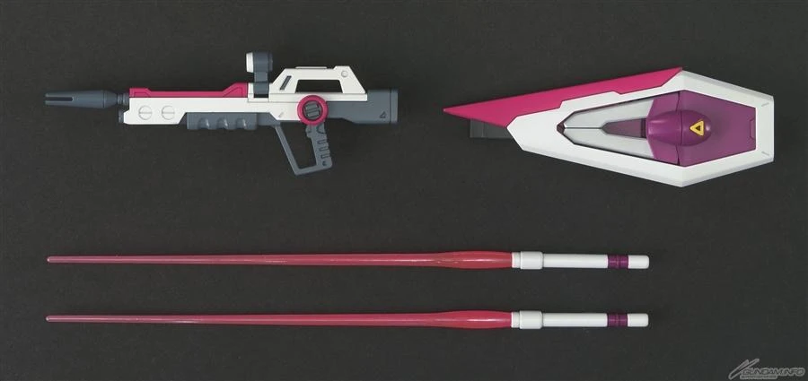 This set comes with pieces to build its beam rifle, beam sabers, the beam carry shield with a boomerang, energy shield, and claw gimmick—use the incldued beam blade effect parts for the separately-sold Phantom-01 backpack and legs.