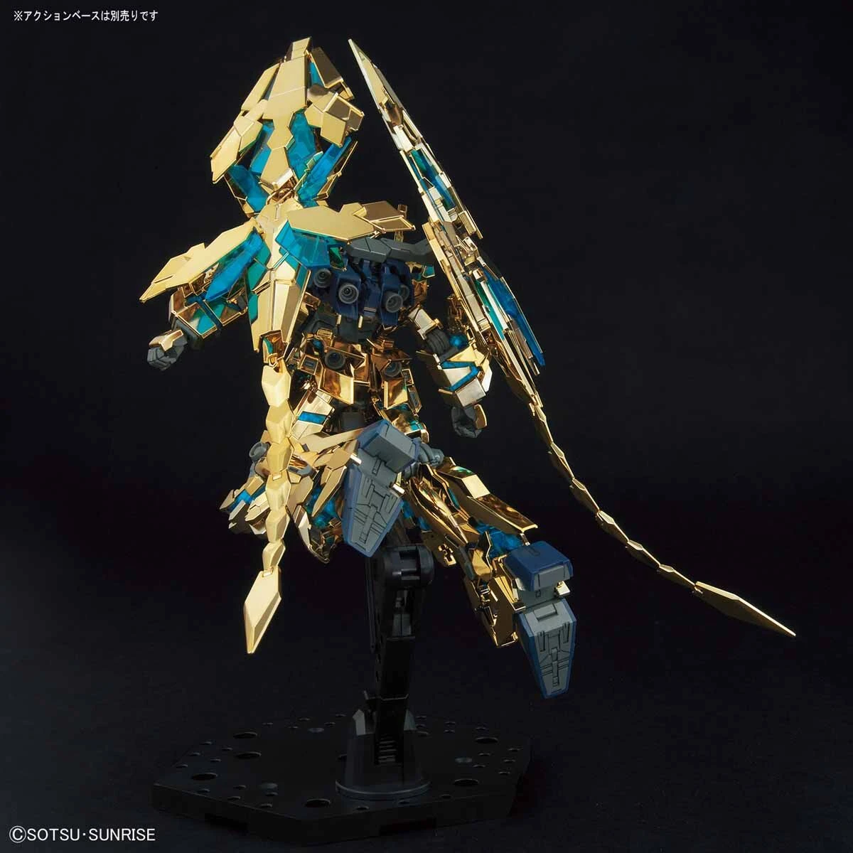 HGUC Unicorn Gundam 03 Phenex is molded in metallic gold coloring for its outer armor and translucent blue plastic for the Psycho Frame. It includes Beam Magnum and detachable tails.