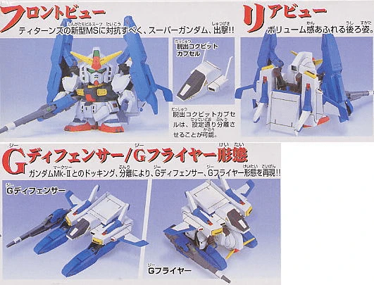 Bandai’s “BB Senshi” line of “SD” Gundam kits (SD stands for “Super Deformed”) are cute little comic interpretations of machines from the original Gundam series. Kits are molded in color and feature easy snap-assembly, suitable for young kids. Many also have little spring-loaded missile shooters that launch plastic projectiles (hands, bombs, etc.). Stickers included, too. Finished kits stand about 5-6cm high.
