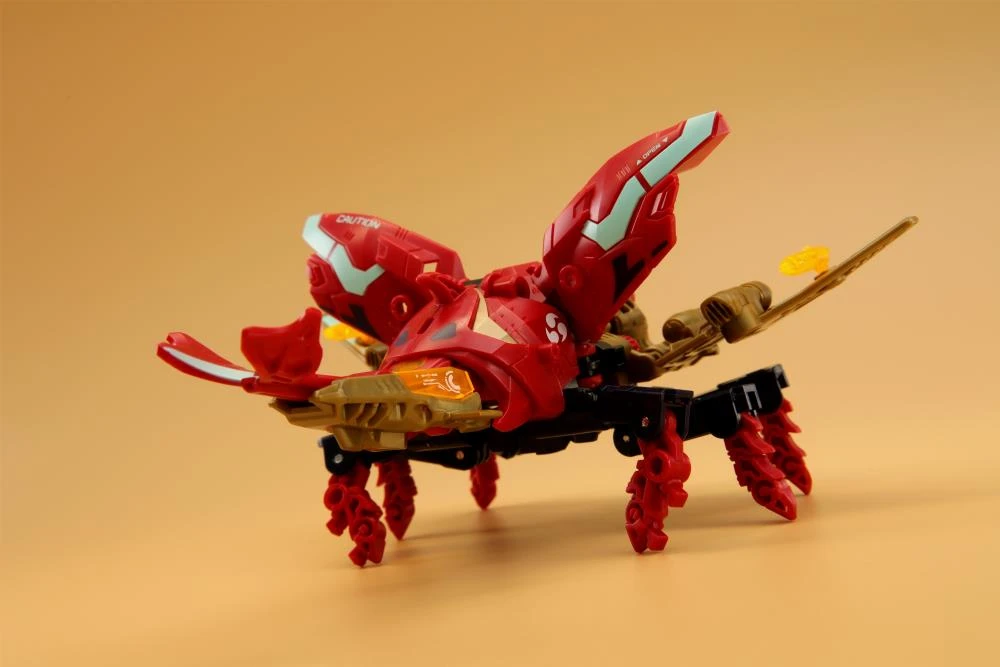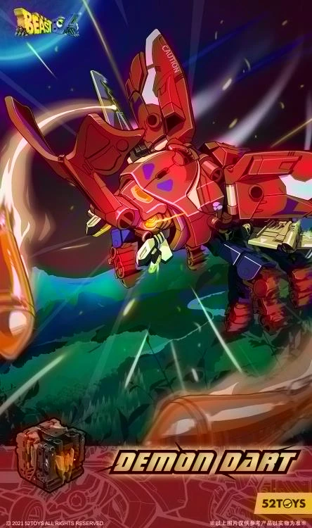 The newest member of 52Toy’s BeastBox lineup is the BB-32 Demon Dart! This bright red beetle mech is impossible to miss, especially when it deploys its golden wings! It also transforms into a small cube!