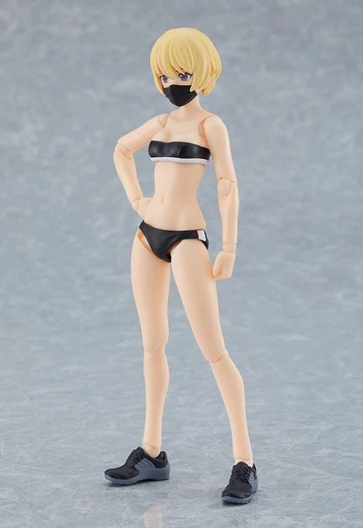 She comes with a smiling face plate and a masked face plate, two different head parts to display her with or without a hat, and a nylon techwear outfit. Her shirt is made of a super flexible material; she also features a tube top-style bikini design. The figure is approximately the same size as the separately-sold Swimsuit Body (Emily).