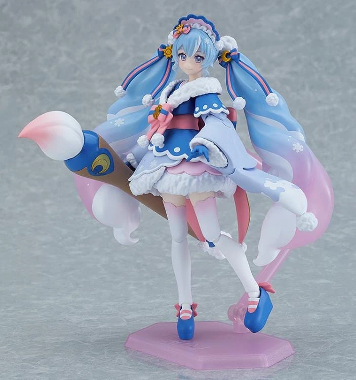 Presenting a figma of a new Snow Miku that paints the morning sky, featuring a cute and fluffy design. 2023 marks the 14th anniversary of Snow Miku, and the 2023 design was once again selected by fans through online votes between a selection of outfits all submitted to piapro by fans! This year the theme was “Clouds and Skies of the Hokkaido Winter”, and the winning Snow Miku design was this version based on illustrations by Isakytm! The figma also comes with Rabbit Yukine in a matching outfit.Â